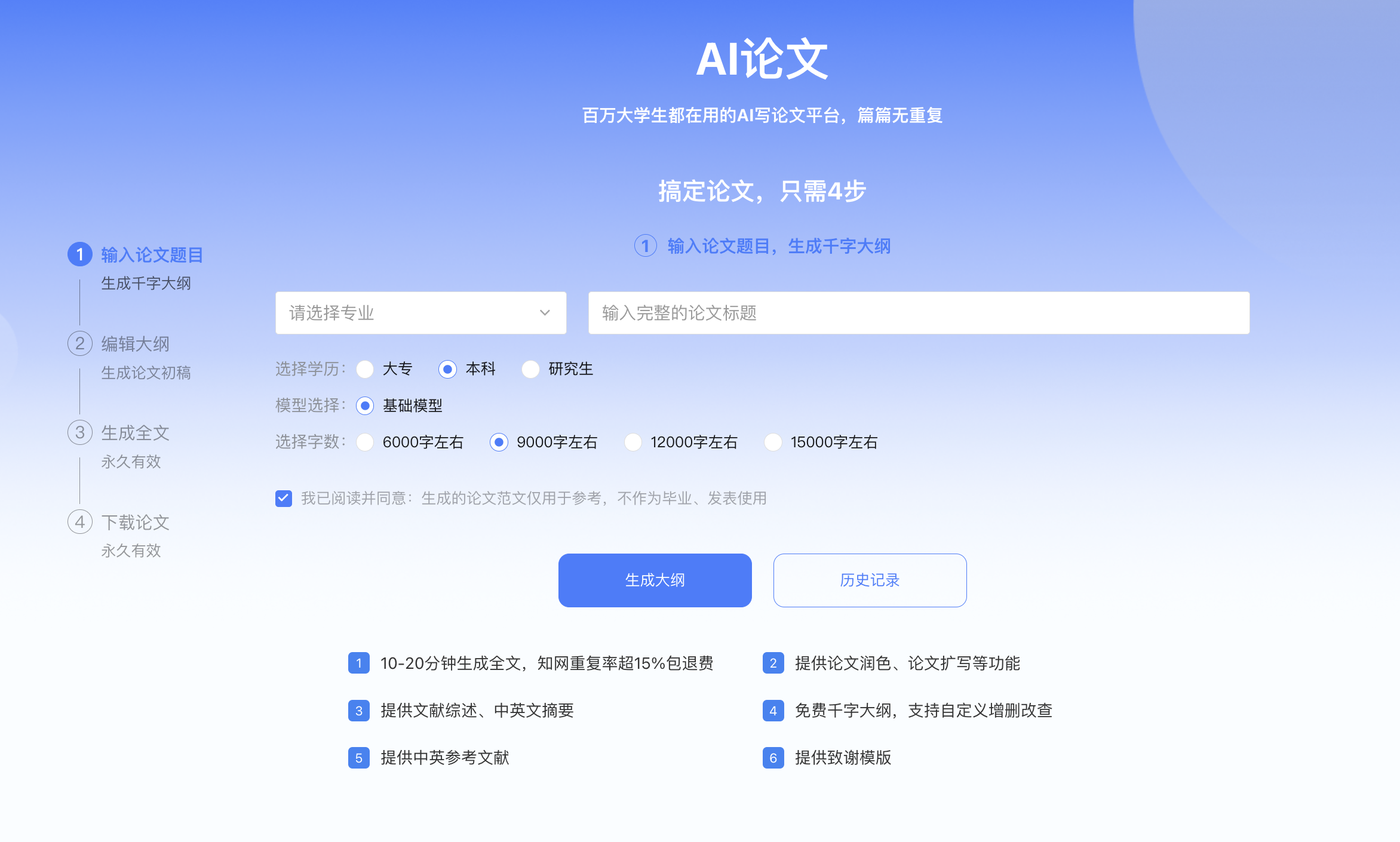 无需下载,网页端就能直接使用。目前支持40s内免费生成大纲,2-3分钟即可生成一篇完整的论文,任何论文都能生成,所有论文均是原创,无需担心查重率和隐私性。